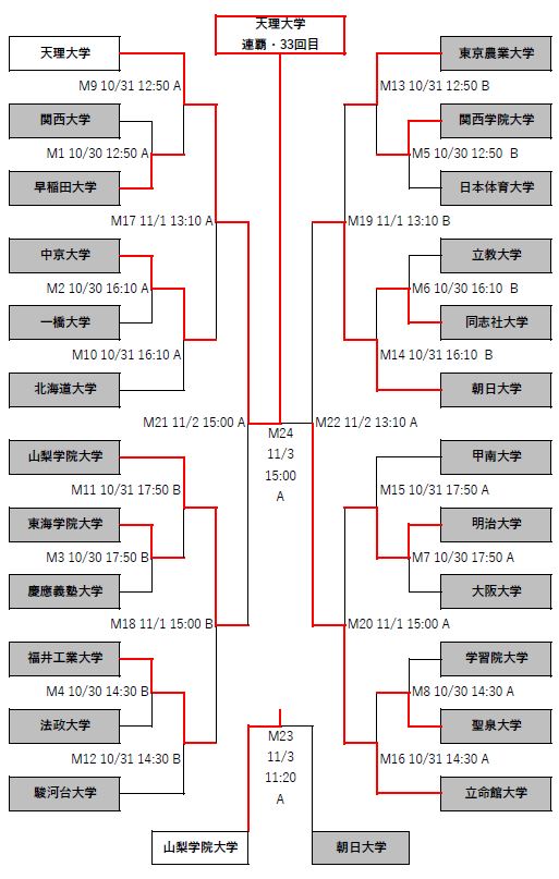 | 第2日 | 10/31(金) | 12:50 | 2回戦 | M9 | 天理大学 (前回優勝) | 4 - 1 | 早稲田大学 (関東第6代表) | 大井メイン | 試合詳細 | ||