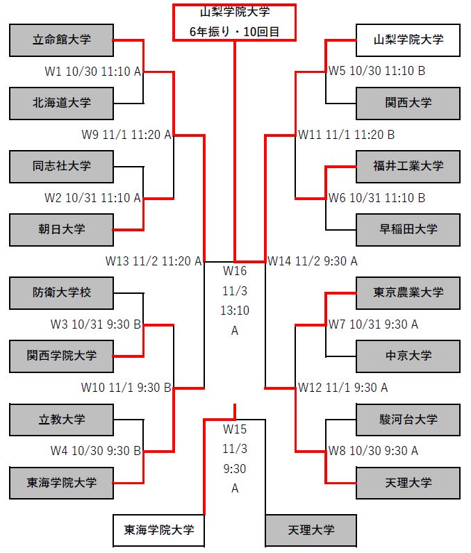 | 最終日 | 11/03(月) | 13:10 | 決勝戦 | W16 | 立命館大学 (前回優勝) | 1 - 3 | 山梨学院大学 (前回3位) | 大井メイン | 試合詳細 | ||