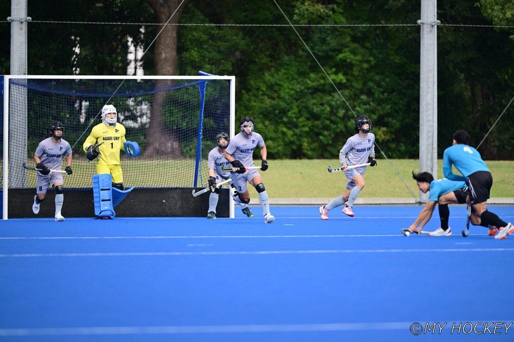対する朝日大は前線へボールを運びたいものの、山梨学院大の厳しいプレスを前に思うような攻撃を展開できない。エンドが変わった3Qでも流れは山梨学院大。34分、右サイドからサークル内に侵入すると、#35篠原がリバースシュートを叩き込みリードを2点に広げた。