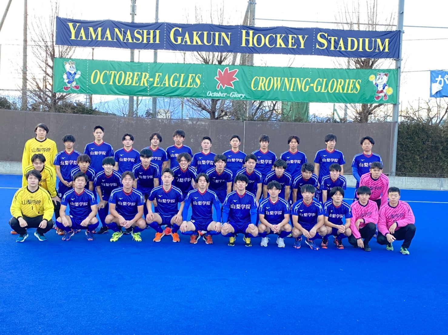 | キャッチコピー | 『チャンピオンチームの育成、オリンピック選手並びに指導者・審判の育成、個々の選手の人間力の向上』を掲げ、2001年に第1期生6名で創部。翌2002年には、活動拠点となる「山梨学院ホッケースタジアム」が完成し、新入生15名を迎え本格的な活動を開始する。2010年には、国内トップリーグである「高円宮牌日本リーグ」と「全日本学生選手権」で共に初優勝を飾り、国内2冠を達成する。現在部員は4年生11名・3年生6名・2年生14名・1年生16名の計47名が在籍。山梨学院カレッジスポーツセンターを中心に、大学挙げての組織的なサポートを受けて活動している。 | |||